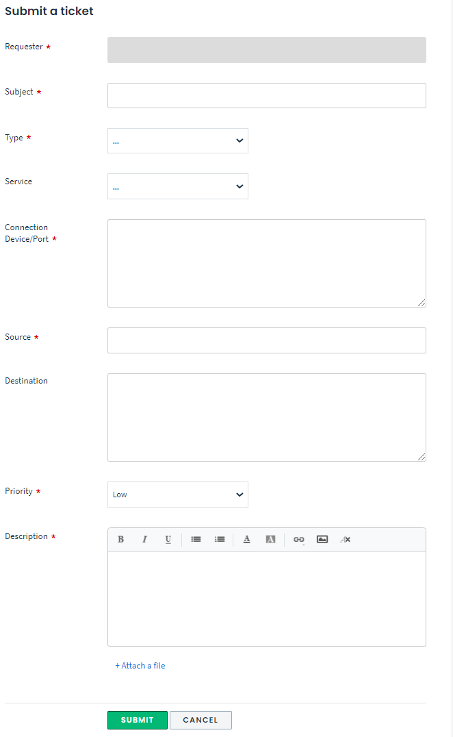 - Description - Any information related to the ticket should be provided here. Please keep in mind that the more information related to the ticket will be added here, the faster the resolution will be done. Here is a free form text, where Layer1 - Layer7 infromation should be provided as well as any other information related to the ticket.